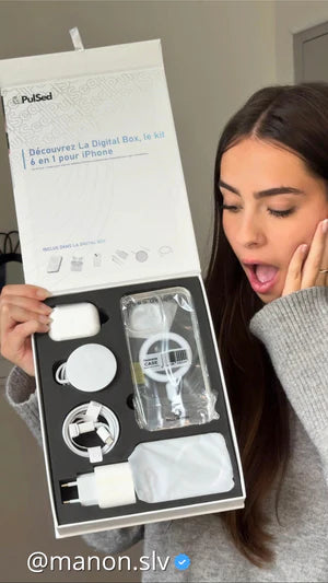 Le pack PulSed Box inclut une batterie à induction MagSafe, des Ecouteurs (2ème génération), une coque transparent MagSafe, un chargeur USB-C 12 W, un câble Lightning et un câble de chargement par induction MagSafe.